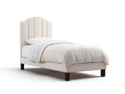 Stylowe łóżko pojedyncze z charakterystycznym, łukowym zagłowiem i pionowymi panelami, które nadają mu elegancki i dekoracyjny wygląd. Jasna kolorystyka sprawia, że mebel dobrze komponuje się z różnymi aranżacjami wnętrz.