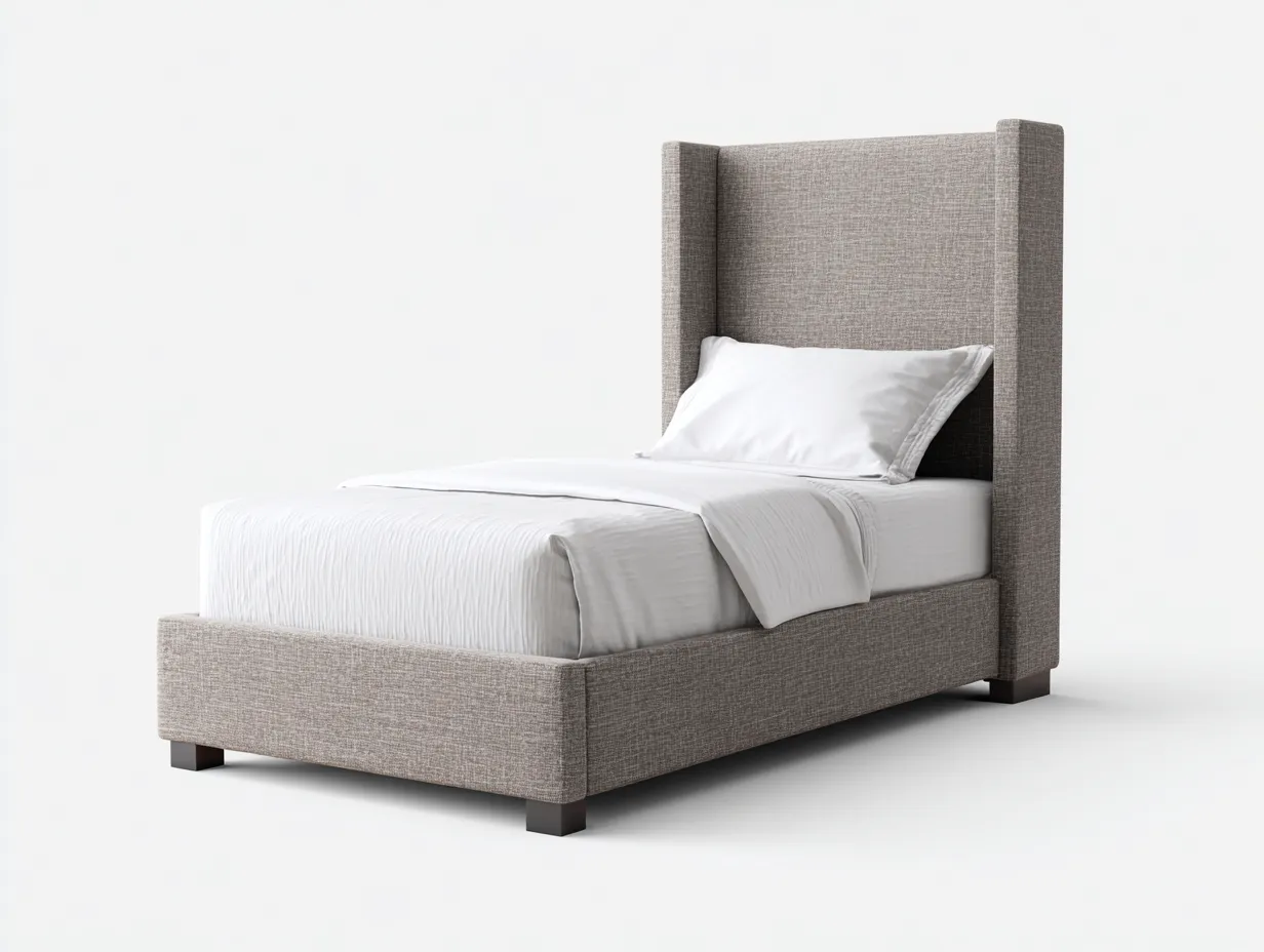 Łóżko pojedyncze o wyrazistej, nowoczesnej formie z wysokim zagłówkiem i bocznymi panelami, które nadają mu elegancki i przytulny charakter. Odcień szaro-brązowy dobrze komponuje się z różnymi aranżacjami wnętrz.